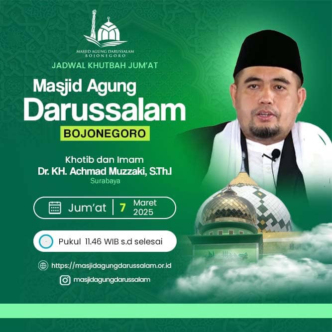 Jum’at perdana bulan suci ramadhan tahun ini, pengurus takmir Masjid Agung Darussalam Bojonegoro menghadirkan Dr. KH. Achmad Muzakki, S.Th.I al Haffidz sebagai khotib sekaligus imam jum’at di Masjid Agung Darussalam Bojonegoro, Jum’at (7/3/25).