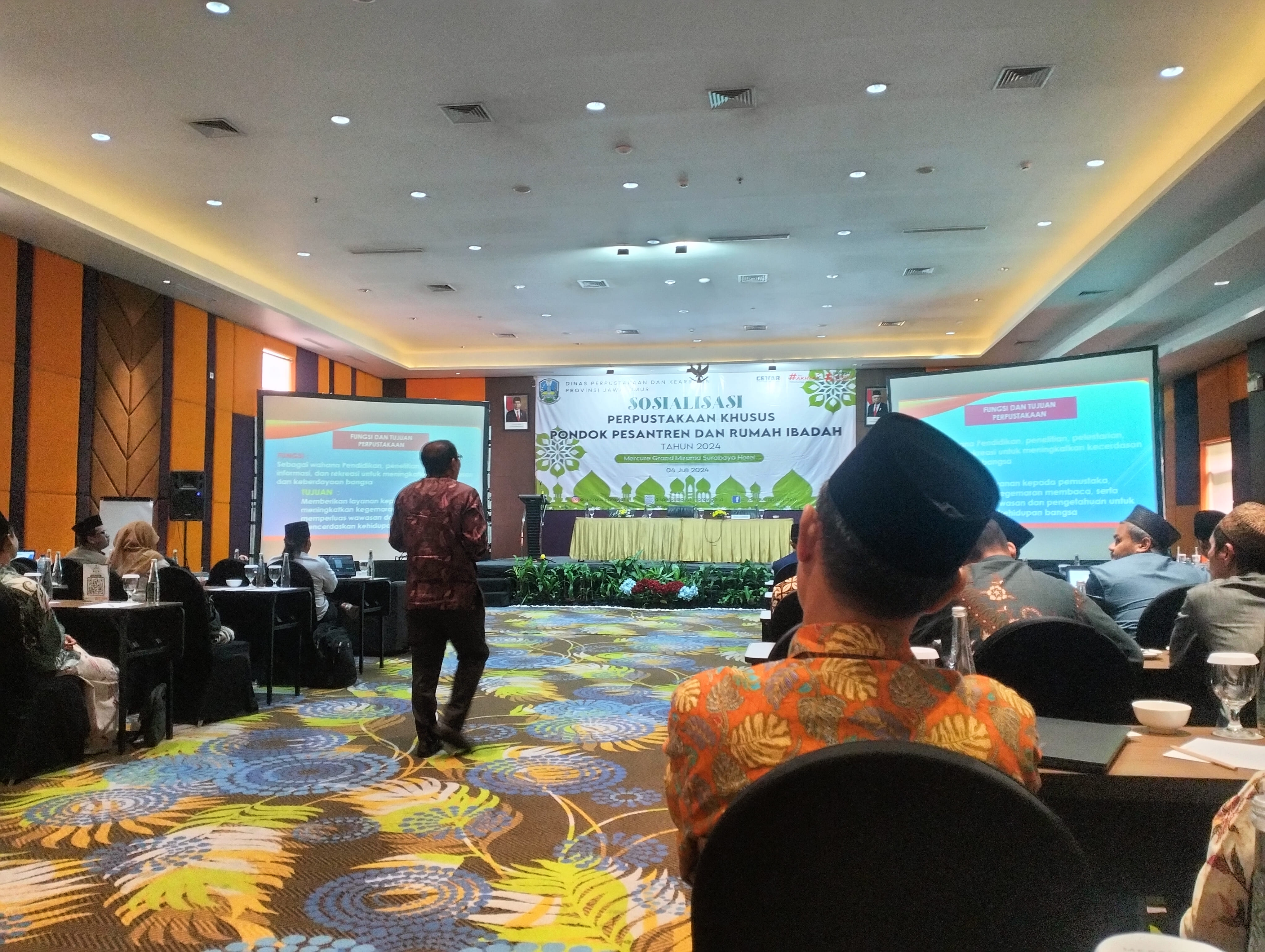Dalam rangka meningkatkan kualitas dan pengembangan perpustakaan khusus (Pondok Pesantren dan Rumah Ibadah) di Jawa Timur agar memenuhi Standar Nasional Perpustakaan yang telah ditetapkan, Dinas Kearsipan dan Perpustakaan Provinsi Jawa Timur menyelenggarakan Sosialisasi Perpustakaan Khusus di Mercure Grand Mirama Surabaya, Kamis (4/7/24).