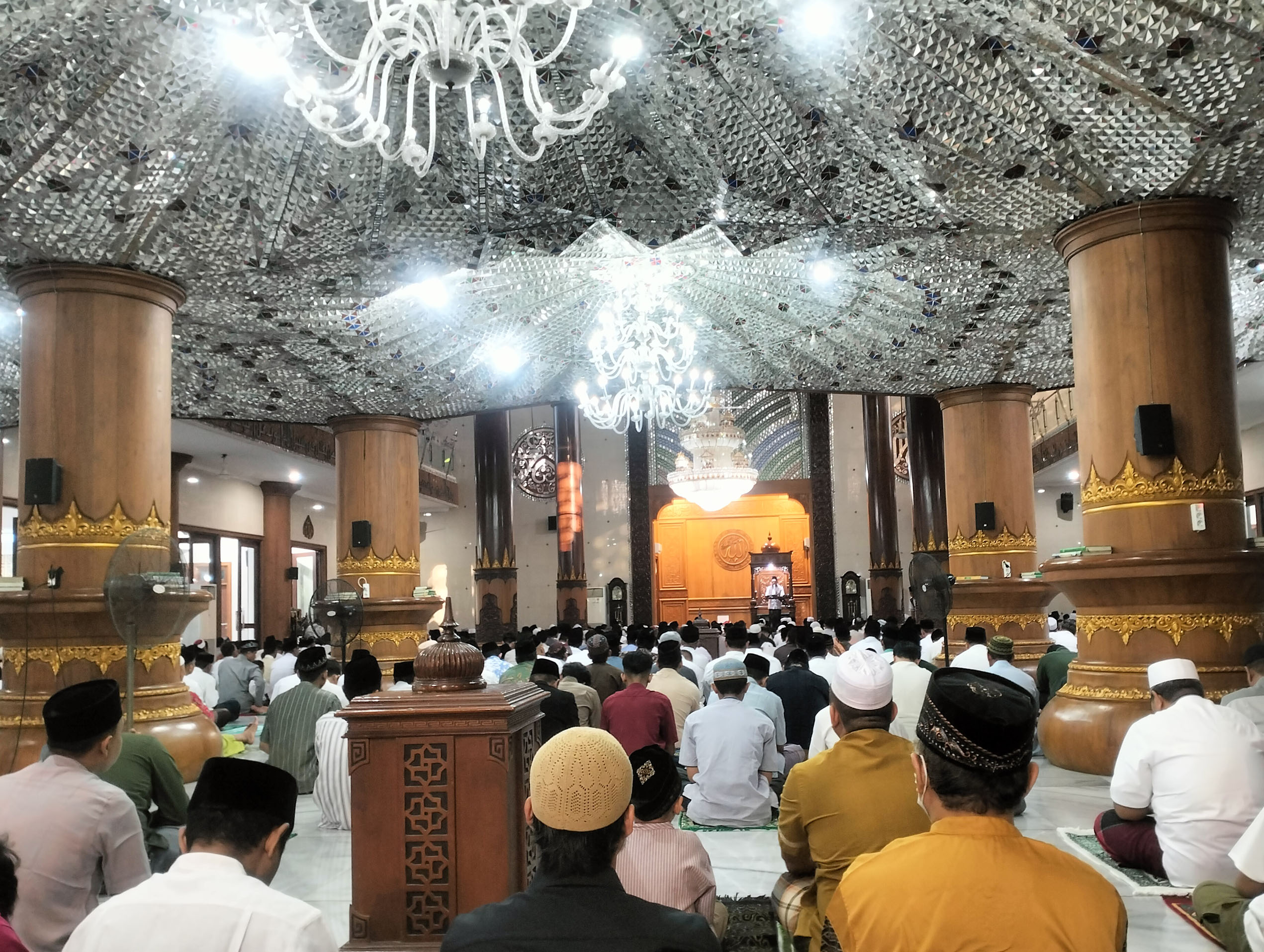 dipadati jama’ah. Tak hanya di dalam dan halaman masjid, jama’ah meluber hingga
